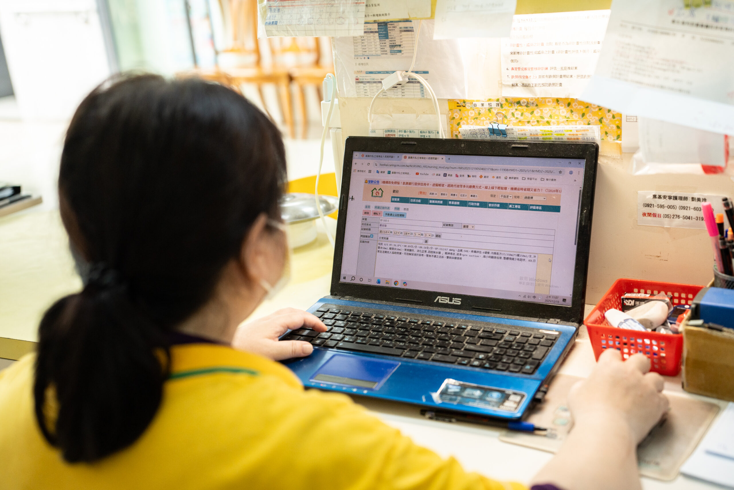 在興穀,照服員的一天總是從紀錄開始。血壓、血糖、用藥,每一項都關乎長輩的安全與健康。過去這些資訊都得手寫在不同表格上,一份紀錄要抄好幾次,交班前還得重新整理、對表、歸檔。主任林芯妤回想:「那時候最怕的不是忙,而是錯。資料太多、分散太廣,光是找一個人的紀錄就得翻半天。」